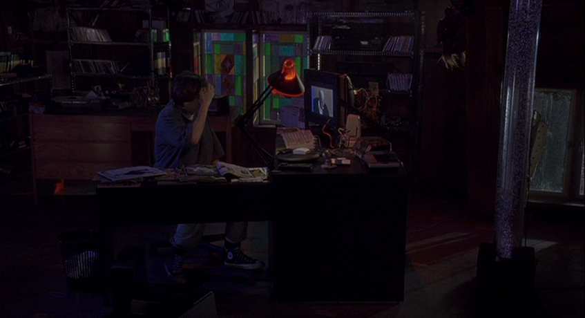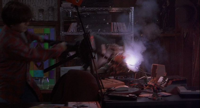 When our protagonist Michael (Edward Furlong) is told about a horror-filled video game that interfaces with a player’s subconscious, he’s eager to call up the phone number printed in a Fangoria advertisement to place an order. His appetite for blood and gore is insatiable, but the game isn’t what he bargained for. Furlong gives an excellent performance, tapping into some of the same themes exhibited by his Terminator 2 character, John Connor, a few years earlier. Michael himself easily fills the role of the smart high school student. He has a voice-controlled computer, Igor, which he primarily uses to place and take phone calls. Red-light-drenched computer hardware spans a large section of his attic bedroom, including an interface to his video camera which he uses to spy on the neighbor-cum-love-interest, Kimberly (Amy Hargreaves). You may call him an introvert, or a misfit — he has few friends and even less family but seems close to his best friend, Kyle (Jamie Marsh).